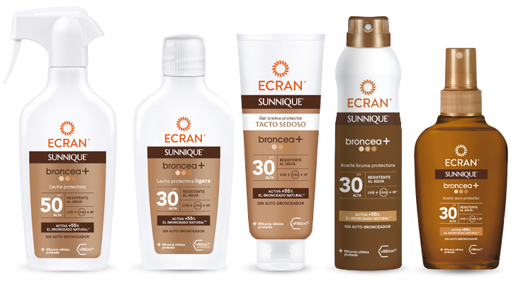 ECRAN® Sunnique® Broncea+ favorise un bronzage plus rapide grâce à sa formule dotée de la technologie PureBronze, qui active jusqu’à 55 % la mélanine. Il aide à obtenir un bronzage beau et uniforme.